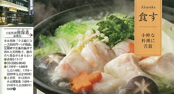 - 12/8(土)週間現代「発見!東京歴史散歩 赤坂」のコーナーにて「土佐料理 袮保希 赤坂店」と「九絵鍋」が掲載されました。